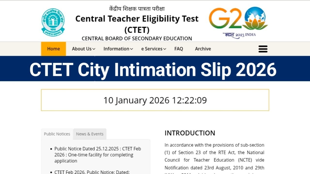 CTET 2026 City Intimation Slip, Admit Card : केंद्रीय शिक्षक पात्रता परीक्षा CTET 2026 (फरवरी सत्र) के लिए आवेदन प्रक्रिया पूरी हो चुकी है। इस परीक्षा का आयोजन केंद्रीय माध्यमिक शिक्षा बोर्ड (CBSE) द्वारा किया जा रहा है। परीक्षा में शामिल होने वाले लाखों अभ्यर्थियों के लिए अब अगला अहम पड़ाव सिटी इंटिमेशन स्लिप और उसके बाद एडमिट कार्ड का है। बोर्ड से जुड़े सूत्रों के अनुसार, CTET फरवरी 2026 के लिए सिटी इंटिमेशन स्लिप जनवरी 2026 के दूसरे सप्ताह में जारी की जा सकती है।