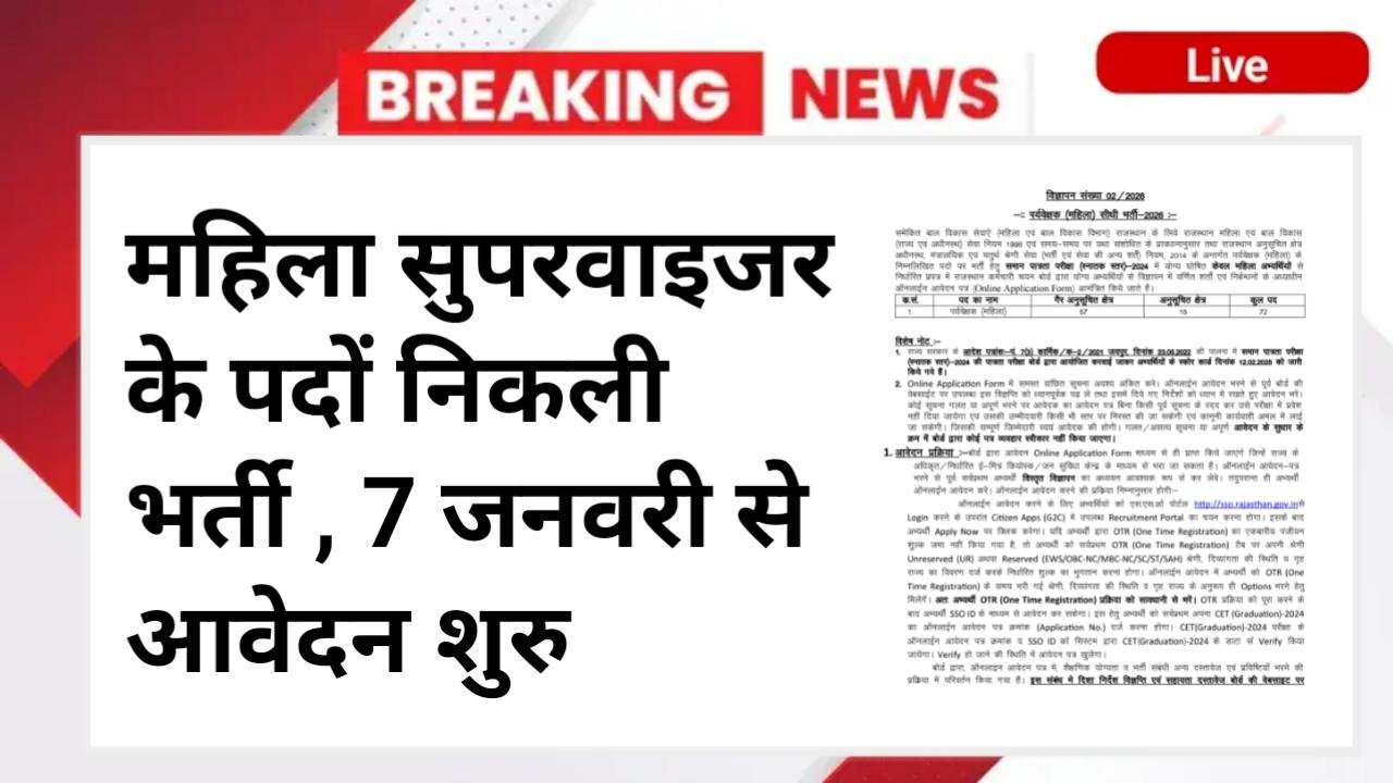 RSSB Female Supervisor Recruitment 2026: राजस्थान में सरकारी नौकरी की तैयारी कर रही महिलाओं के लिए बड़ी खबर सामने आई है। राजस्थान कर्मचारी चयन बोर्ड (RSSB), जयपुर द्वारा महिला एवं बाल विकास विभाग के अंतर्गत पर्यवेक्षक (महिला) के 72 रिक्त पदों पर नोटिफिकेशन जारी कर दिया गया है। इस नोटिफिकेशन के अनुसार योग्य महिला अभ्यर्थी 7 जनवरी 2026 से 5 फरवरी 2026 तक ऑनलाइन आवेदन कर सकती हैं। नोटिफिकेशन 6 जनवरी 2026 को आधिकारिक वेबसाइट पर जारी किया गया है।