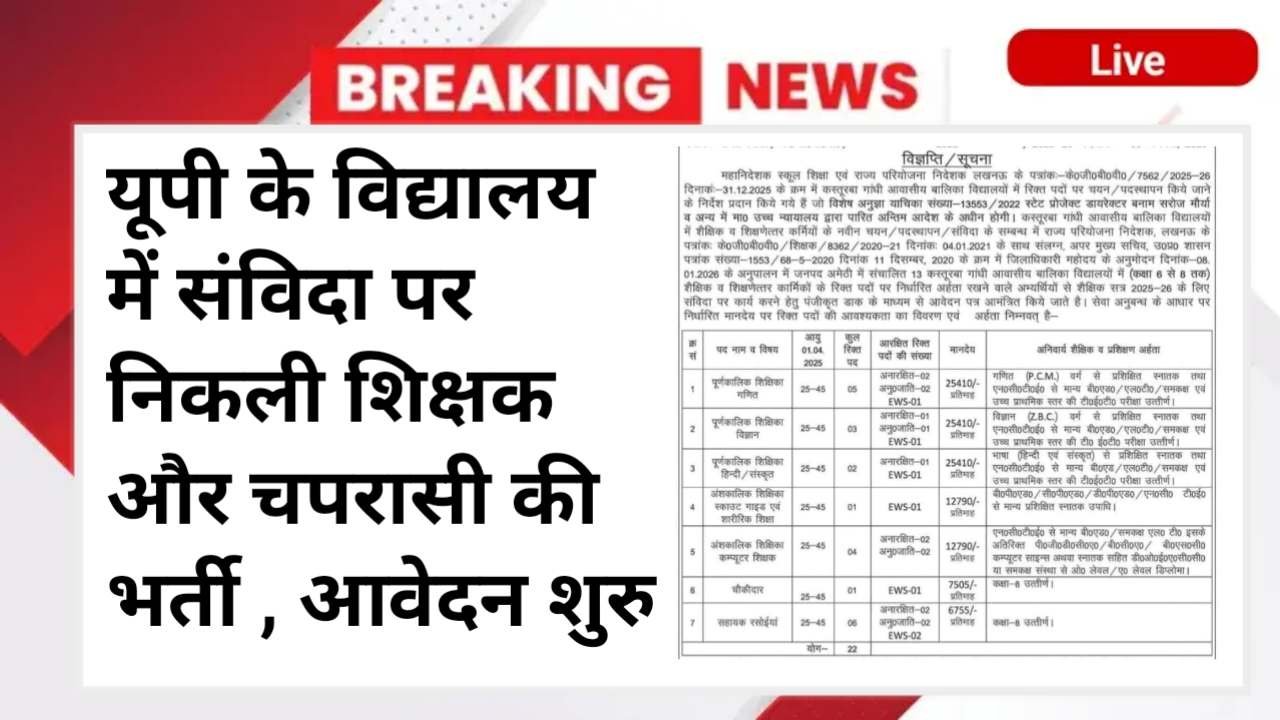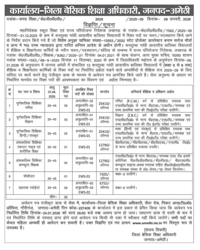 UPKGBV Notification Out 2026: अगर आपका भी सपना है उत्तर प्रदेश में शिक्षक और अन्य प्रतिष्ठित पद पर नौकरी प्राप्त करने का तो आप सभी के लिए शानदार मौका है। जनपद अमेठी से शिक्षा क्षेत्र से जुड़ी अहम खबर सामने आई है। जिला बेसिक शिक्षा अधिकारी, अमेठी की ओर से एक आधिकारिक विज्ञप्ति जारी कर कस्तूरबा गांधी आवासीय बालिका विद्यालयों में शैक्षिक सत्र 2025-26 के लिए विभिन्न रिक्त पदों पर चयन/पदस्थापन के लिए आवेदन आमंत्रित किए गए हैं। यह नियुक्तियां पूर्णतः संविदा (Contract Basis) पर की जाएंगी।